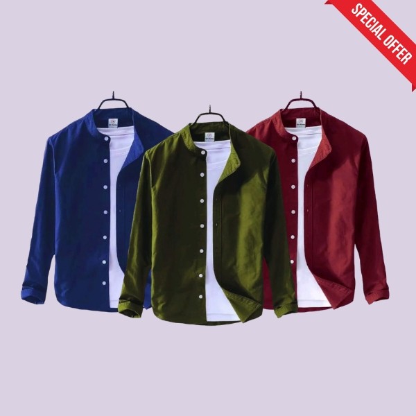 Buy a 3-piece bundle pack of band-collar Oxford soft cotton full-sleeve shirts for men, now available at a discount in our online store. Enjoy premium comfort, style, and quality at an unbeatable offer!